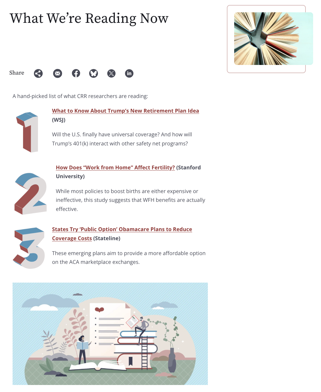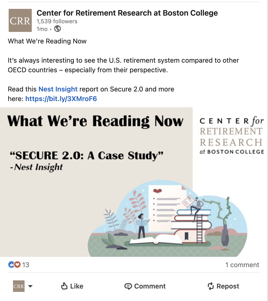 At Boston College, I launched a bi-weekly social media campaign and webpage to build a more personable, industry-connected presence for the Center for Retirement Research.